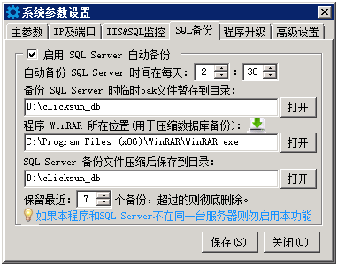 在点晴OA服务器上安装点晴MIS信息通后台服务程序,该程序提供了点晴OA数据库自动备份并压缩保存的功能,并且可以设置保留最近多少天的备份,非常的方便实用。