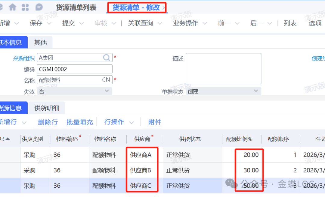 在企业的采购业务中,将一笔采购需求按照一定的比例自动分配给多个供应商,是常见的货源管理需求。