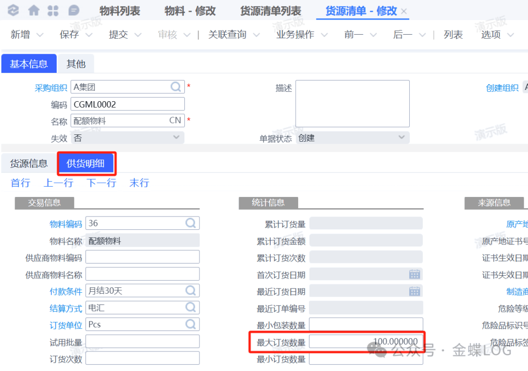 根据案例背景,在货源清单中为该物料设置采购供应商的配额比例以及最大订货量。
