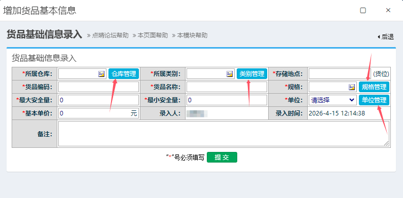 点晴MIS系统中低值易耗品管理里货品基础信息管理如何添加字段?字段是写死的,不支持自定义增加字段。基础资料中的仓库、类别、规格、单位,支持自定义增加,需要以管理员身份登录,就会看到上面界面中的四个维护按钮了。如果需要增加新的字段,请联系点晴公司在线客服(点晴OA网管交流群号:226494948),咨询付费增加字段事宜。